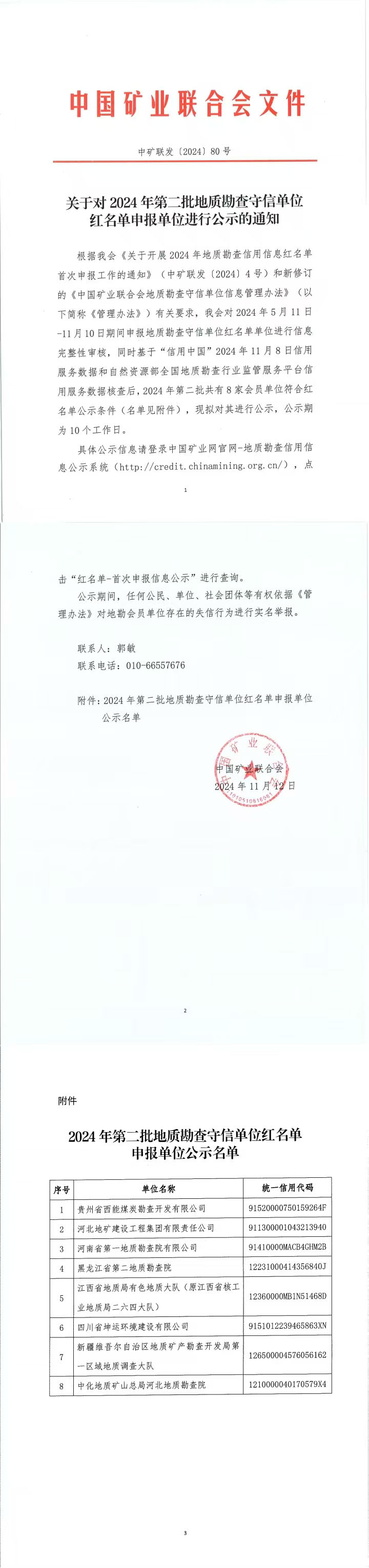 根据我会《关于开展2024年地质勘查信用信息红名单首次申报工作的通知》(中矿联发[2024]4号)和新修订的《中国矿业联合会地质勘查守信单位信息管理办法》(以下简称《管理办法》)有关要求,我会对2024年5月11日-11月10日期间申报地质勘查守信单位红名单单位进行信息完整性审核,同时基于“信用中国”2024年11月8日信用服务数据和自然资源部全国地质勘查行业监管服务平台信用服务数据核查后,2024年第二批共有8家会员单位符合红名单公示条件(名单见附件),现拟对其进行公示,公示期为10个工作日。
