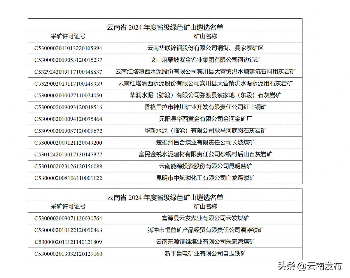 近日,云南省自然资源厅发布公告,2024年有16家矿山通过遴选,纳入云南省省级绿色矿山名录。绿色矿山是指矿山企业在矿产资源开发全过程中,实施科学有序地开采,对矿区及周边生态环境扰动控制在可控范围内,实现矿区环境生态化、开采方式科学化、资源利用高效化、企业管理规范化、矿区社区和谐化的矿山。云南省2024年度省级绿色矿山名录↓↓(云南省自然资源厅)
