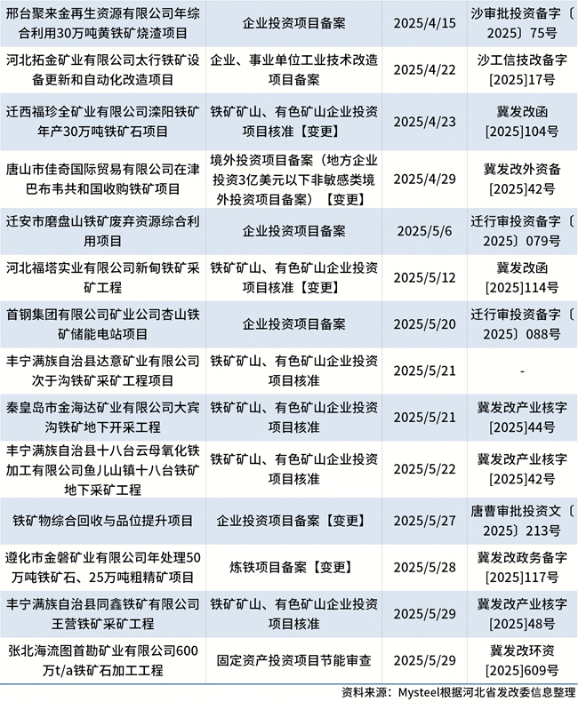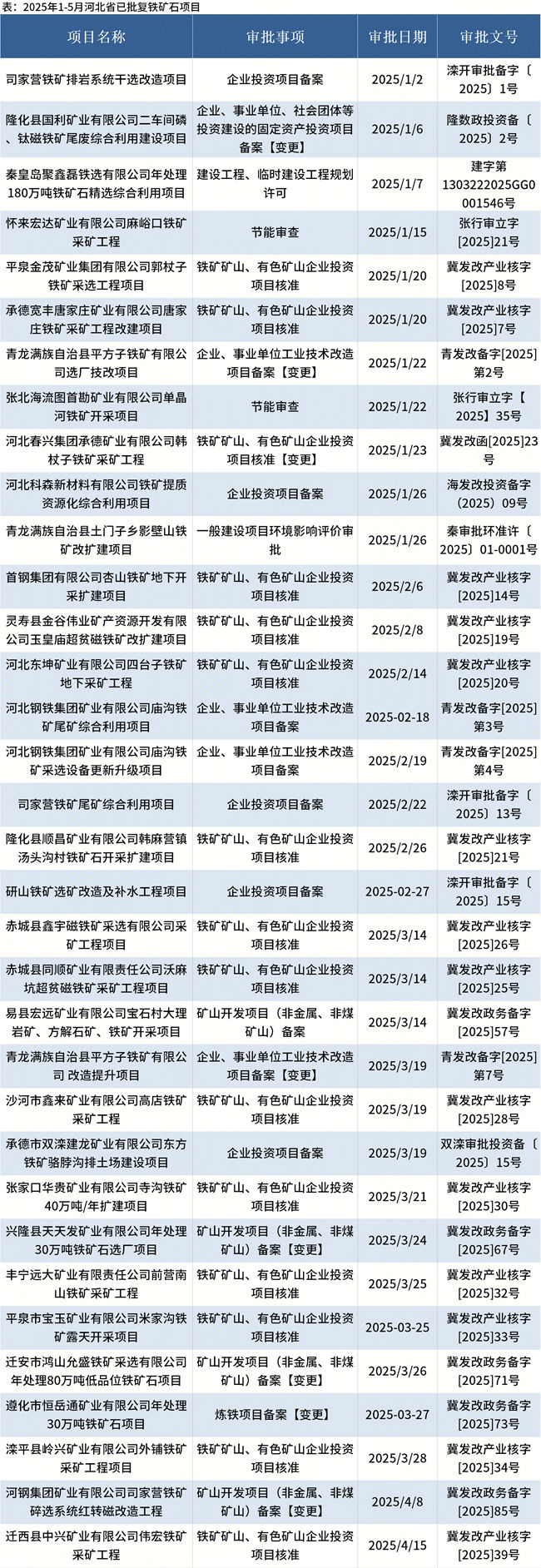 据Mysteel不完全统计,2025年1-5月河北省共批复铁矿石相关项目48个,分别是21个铁矿矿山、有色矿山企业投资项目核准或【变更】、9个企业投资项目备案或【变更】、2个节能审查、4个矿山开发项目(非金属、非煤矿山)备案或【变更】、2个炼铁项目备案【变更】、5个企业、事业单位工业技术改造项目备案或【变更】、1个境外投资项目备案(地方企业投资3亿美元以下非敏感类境外投资项目备案)【变更】、1个建设工程、临时建设工程规划许可、1个企业投资项目备案、1个一般建设项目环境影响评价审批和1个固定资产投资项目节能审查。