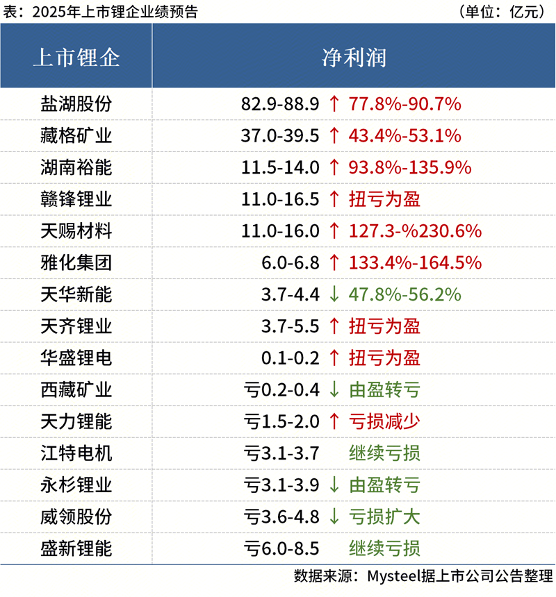 据Mysteel不完全统计,截至2月4日,15家上市锂企公布2025年业绩预告,9家锂企盈利,其中赣锋锂业、天齐锂业及华盛锂电3家锂企实现扭亏为盈。具体如下: