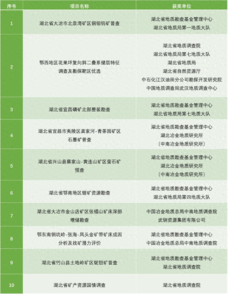 12月5日,湖北省自然资源厅联合省地质学会正式发布湖北省2023年度地质找矿、地质科技进展十大成果,《湖北省大冶市北泉湾矿区铜钼钨矿普查》《中国矿产地质志·湖北卷》等成果纷纷入围。本次评选活动自今年6月启动,经单位推荐、初评、终评和公示等程序,形成最终评选结果,旨在服务湖北省新一轮找矿突破战略行动,培养地质科技人才,促进地质工作发展。
