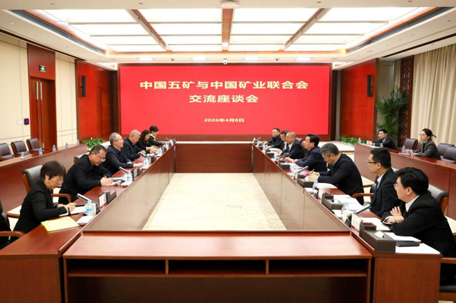 2026年4月8日下午,中国矿业联合会党委书记、会长程利伟一行到访中国五矿,与中国五矿党组书记、董事长陈得信等举行座谈。双方围绕全球矿业发展形势、国家矿产资源安全保障、矿业科技创新与全产业链建设、企业高质量发展及2026(第二十八届)中国国际矿业大会合作等议题进行了深入交流。