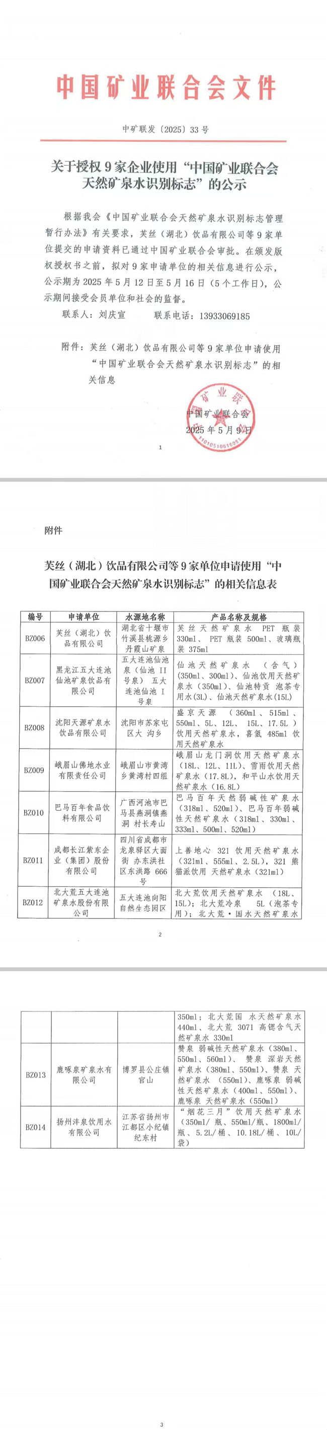 根据我会《中国矿业联合会天然矿泉水识别标志管理暂行办法》有关要求,芙丝(湖北)饮品有限公司等9家单位提交的申请资料已通过中国矿业联合会审批。在颁发版权授权书之前,拟对9家申请单位的相关信息进行公示,公示期为2025年 5 月12日至5月16日(5个工作日),公示期间接受会员单位和社会的监督。