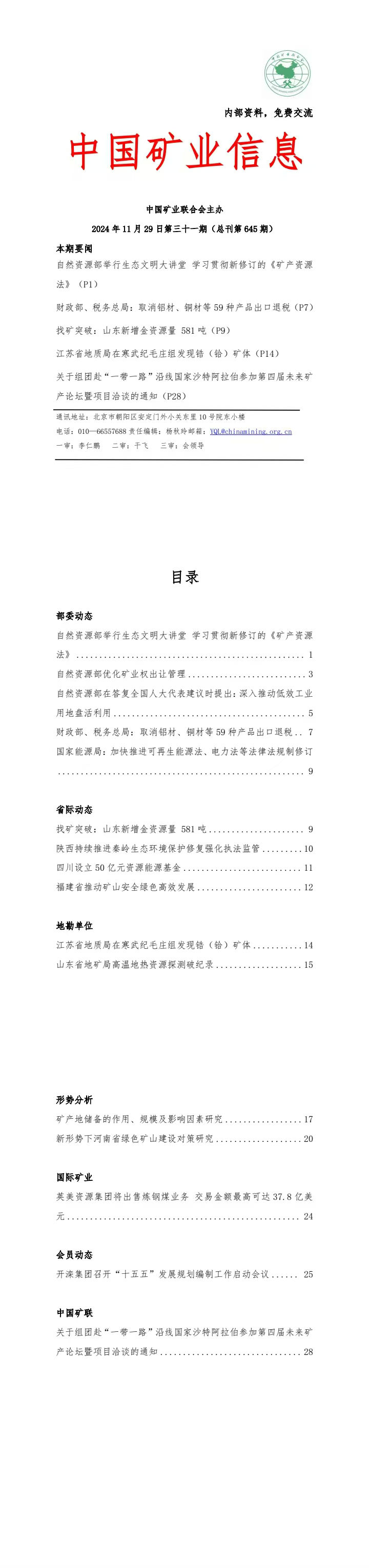 中国矿业网:2024年11月25日—11月29日《中国矿业信息》第三十一期
