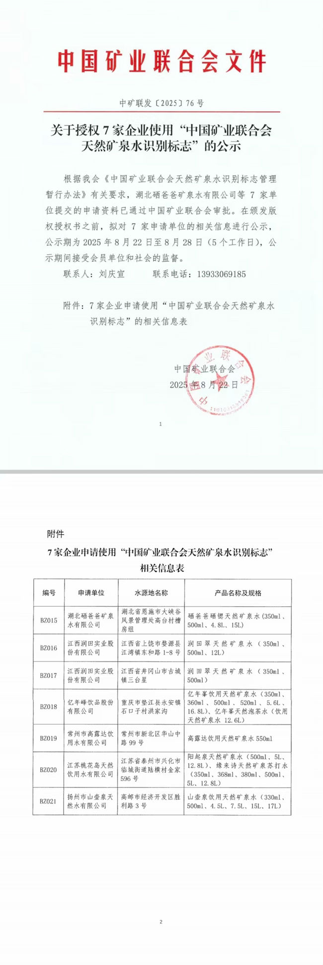 关于授权7家企业使用“中国矿业联合会天然矿泉水识别标志”的公示