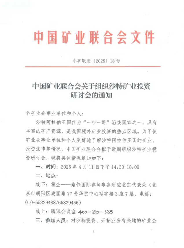 沙特阿拉伯王国作为“一带一路”沿线国家之一,具有丰富的矿产资源,是我国境外矿业投资的热点区域。为了使矿业企事业单位和个人更好地了解沙特阿拉伯王国的矿业、投资法律等情况,中国矿业联合会拟于近期组织沙特矿业投资研讨会。
