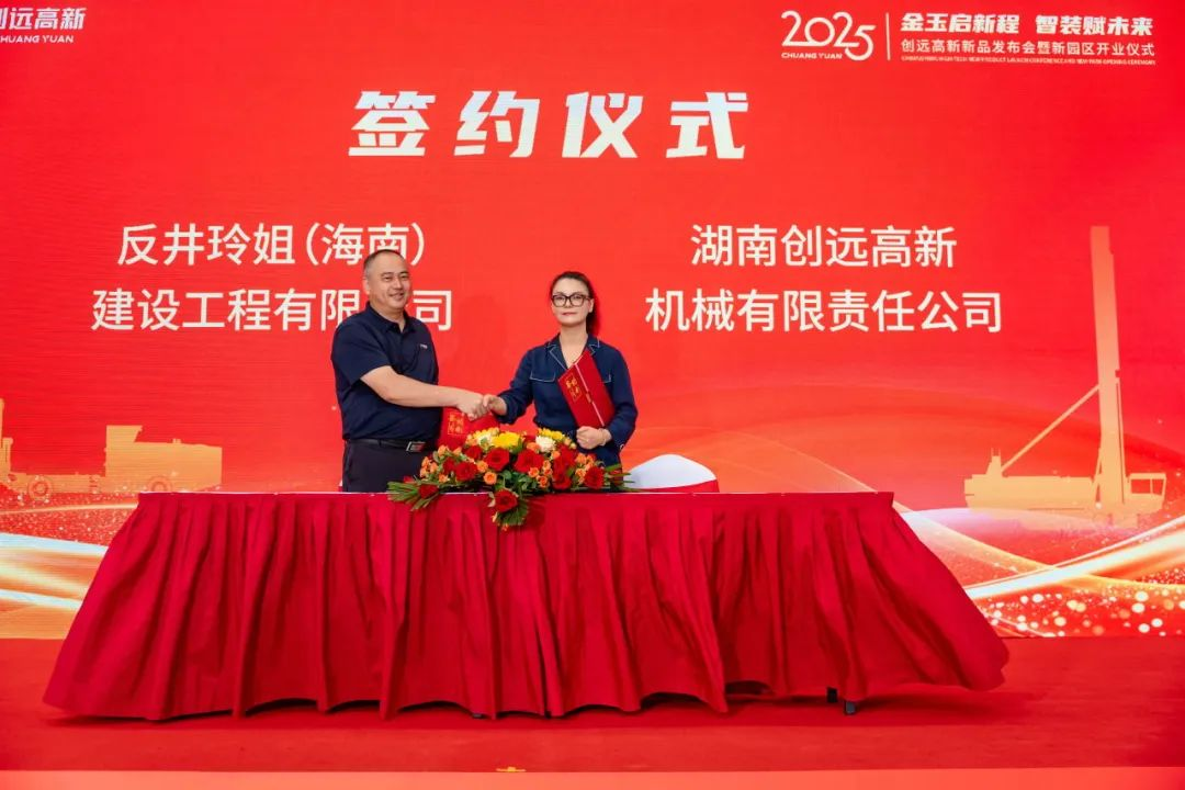首单落地:反井玲姐(海南)建设工程有限公司总经理王小玲与创远高新营销副总裁张学泉现场签署协议,采购2台创远180VS天井钻机。这是金玉园区投产后的首笔重要订单,体现了市场对创远产品性能与品质的信任。