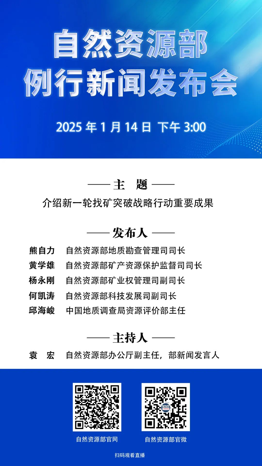 1月14日下午3:00!自然资源部举行例行新闻发布会——介绍新一轮找矿突破战略行动重要成果