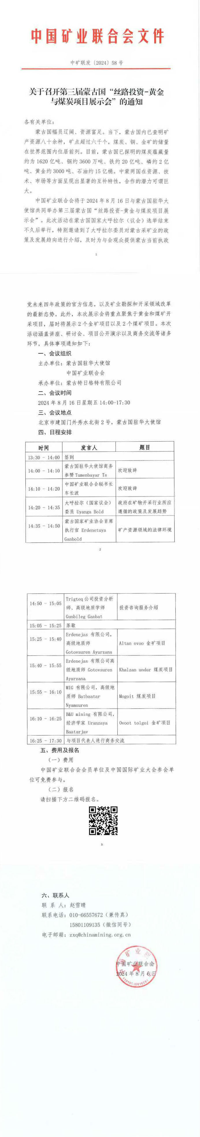 关于召开第三届蒙古国“丝路投资-黄金与煤炭项目展示会”的通知