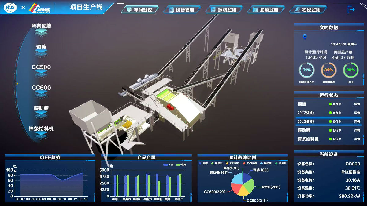 智能运维系统主要围绕三大核心模块构建服务体系。其中,产线数据可视化3D SCADA系统以三维场景真实还原生产线运行状态,整合关键设备数据,实现对生产流程的全方位感知与智能分析;设备预测性维护模块通过振动、油液、成品粒度等多参数实时监测,建立协同管控机制,实现故障预警与维护成本双向管控;AR交互系统则有效破解培训难题,借助智能巡检眼镜与AR拆装培训模块,提升现场操作与远程协作效率。